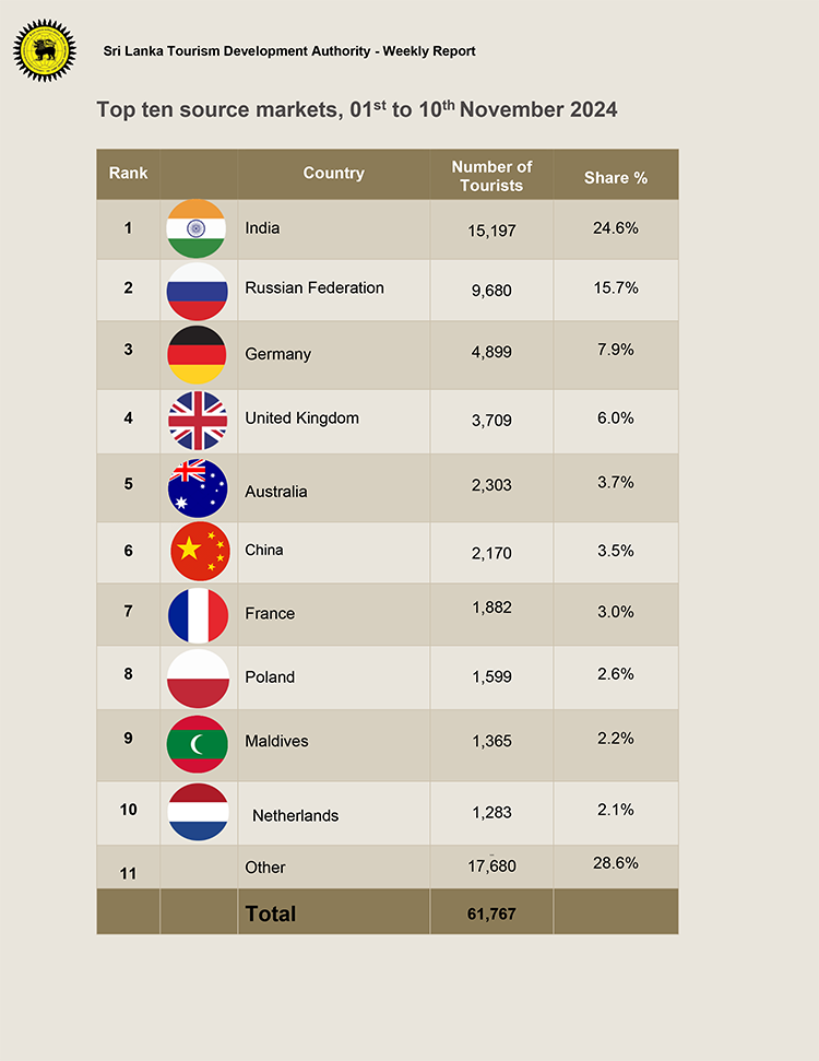එහිදී නොවැම්බර් 01 සිට 10 දක්වා කාලපරිච්ඡේදය තුළ දී රුසියාවනේ 9,680ක්, ජර්මනියෙන් 4,899ක්, එක්සත් රාජධානියෙන් 3,709ක්, ඕස්ට්රේලියාවෙන් 2,303 ක් ලෙසින් වැඩිවශයෙන් මෙරටට විදෙස් සංචාරකයින් පැමිණ ඇත. මෙම වකවානුව තුළ වැඩියෙන්ම මෙරටට සංචාරකයින් පැමිණි රට ලෙසින් ඉන්දියාව සටහන් වන අතර එම ප්රමාණය 15,197 කි.