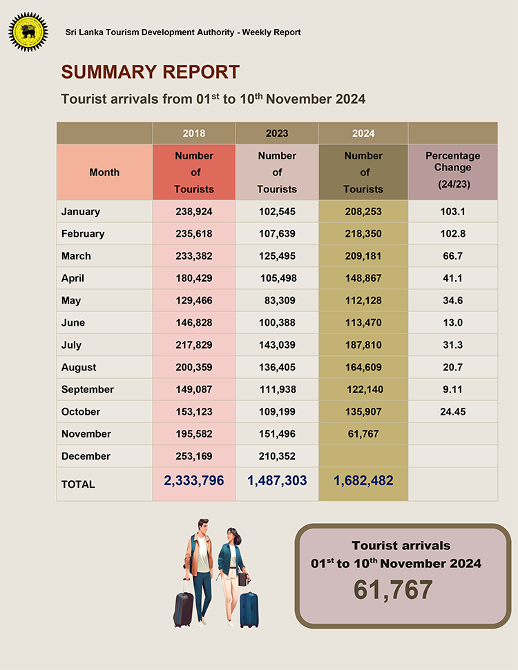ශ්රී ලංකා සංචාරක සංවර්ධන අධිකාරියේ නවතම සංඛ්යාලේඛනවලට අනුව 2024 නොවැම්බර් මාසයේ මුල් දින 10 තුළ මෙරටට පැමිණ ඇති සංචාරකයින් සංඛ්යාව 61,767 ක් ලෙසින් වාර්තා වේ.