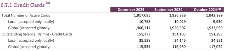 මෙම සමස්ත ක්රෙඩිට් කාඩ්පත් වෙනුවෙන් 2024 ඔක්තෝබර් මාසය අවසන් වන විට හිඟව පවතිව මුළු මුදල රු. මිලියන 151,293 ක් ලෙසින් වාර්තා වේ.